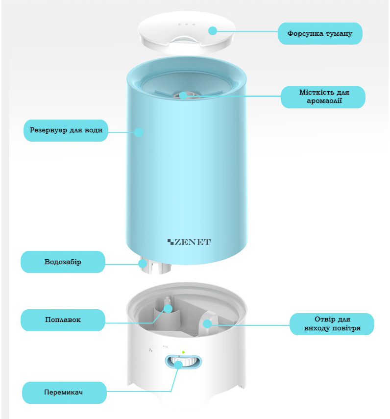 Зволожувач повітря Zenet Zet-406 на 3 л - кліматичний прилад, що використовується в першу чергу для підвищення вологості повітря в приміщеннях і підтримання оптимального рівня вологості, комфортний для органів дихання.